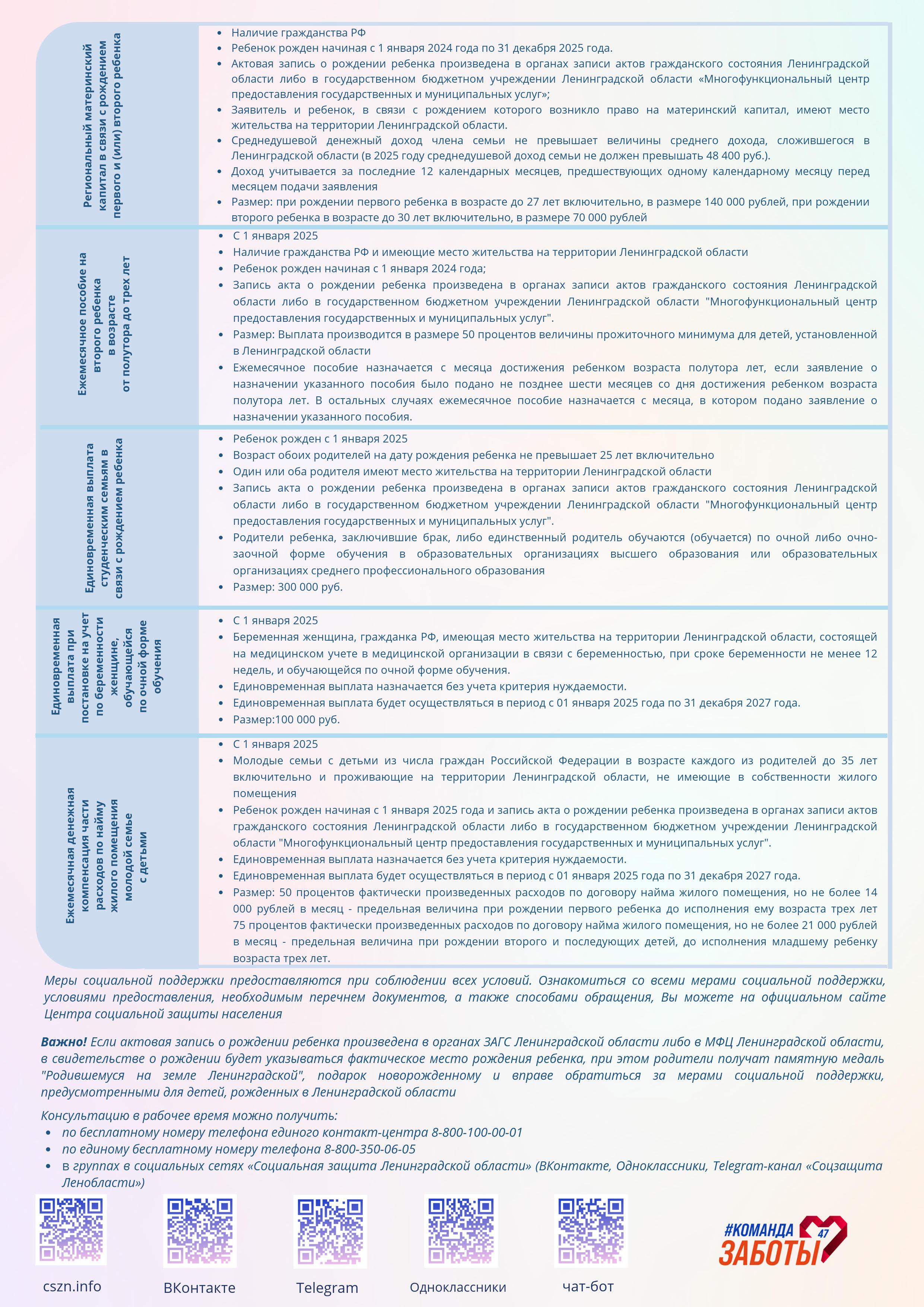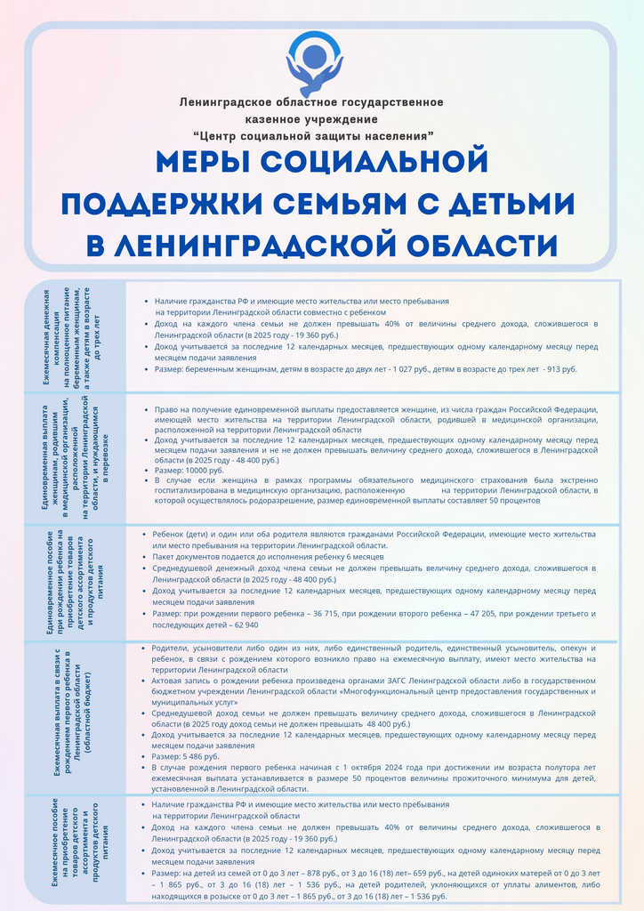 Памятка ЛОГКУ "Центр социальной защиты населения": Меры социальной поддержки семьям с детьми в Ленинградской области